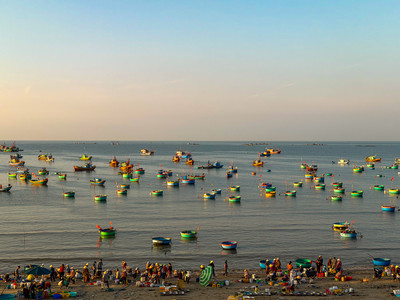 Dieses Erlebnis sollte man sich auf keinen Fall entgehen lassen. Die Bucht bei dem Dorf Mui Ne am zeitigen Morgen, und das geschäftige Treiben davor. Wir fahren kurz vor Sonnenaufgang dahin, um das zur besten Zeit zu erleben. Wir fahren kurz vor Sonnenaufgang dahin, um das zur besten Zeit zu erleben. Von unserem Hotel bis dahin sind es mit unserem Bus etwa 20 Minuten.