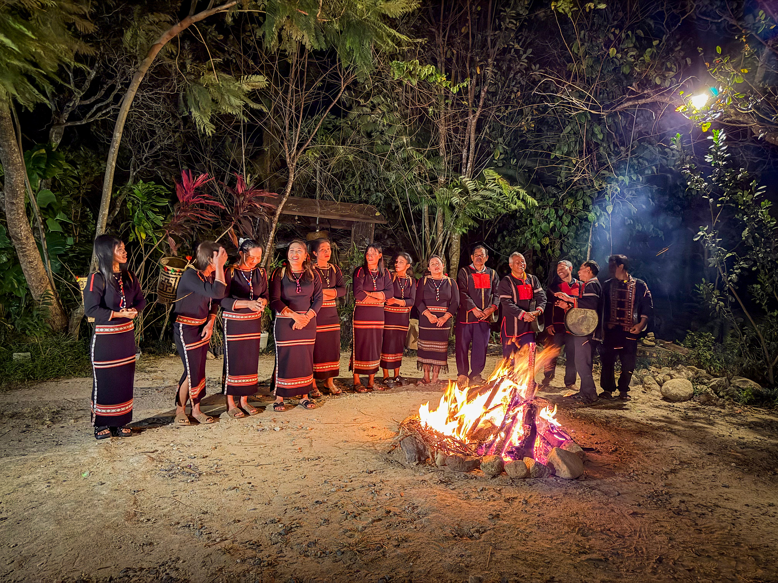 Eine Gruppe der K'ho bereitet sich für einen traditionellen Tanz vor. Dies ist noch sehr authentisch und nicht touristisch verdorben. Touristen gibt es hier ohnehin nur selten und nur sehr wenige. Unser Bungalow-Anlage am Rande des Dorfes ist die einzige weit und breit, und sie hat nur acht Zimmer. Inhaber der Bungalow-Anlage ist übrigens ein Deutscher. Er hat sich hier mit seiner vietnamesischen Frau aus Begeisterung für die Natur und diese Region niedergelassen.