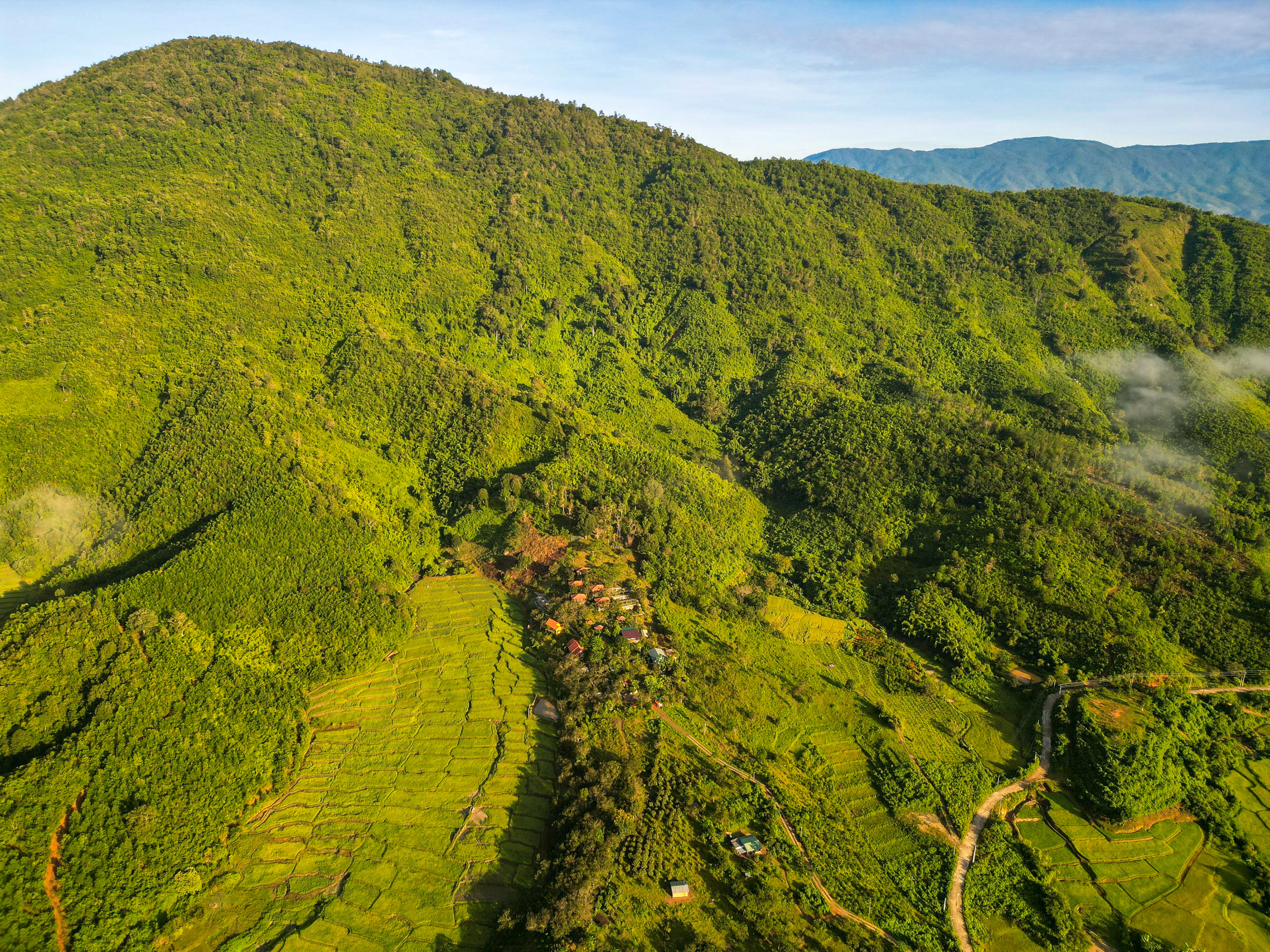 Unten, in Alleinlage auf dem Hügel in der Lam Dong Provinz, befindet sich unsere Bungalow Anlage im Zentralen Hochland. Die Reisfelder sind zwischen Oktober und Februar abgeerntet. Diese Gegend, weit jenseits touristischer Pfade zu besuchen, ist jedoch immer ein besonderes Erlebnis. Hier leben die K'ho, eine ethische Minderheit von Vietnam.