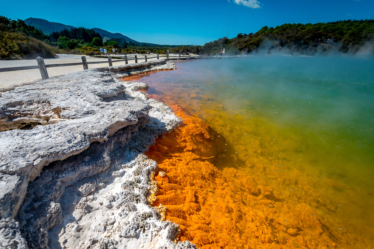 Vulkanische Ereignisse formten diese Region, deren Naturwunder wir heute im Wai-O-Tapu Thermal Wonderland, dem buntesten der Thermalgebiete, genauer bestaunen können. Hier finden wir bunte Sinterterrassen, den brodelnden Champagne Pool, blubbernde Schlammlöcher, Krater und die stinkenden Dämpfe der Schwefelfumarolen.